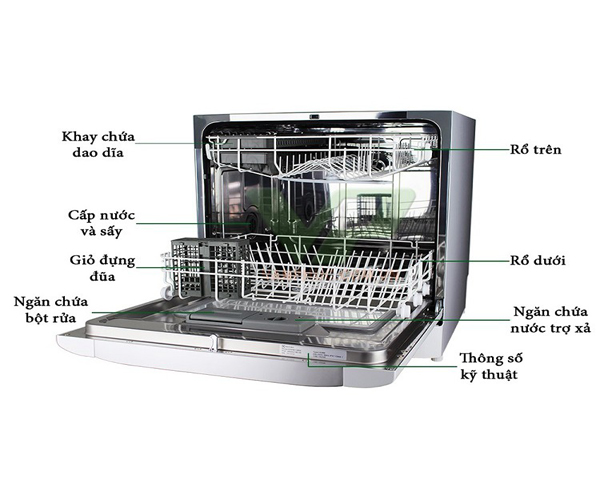 Máy được thiết kế 1 ngăn và 1 giá lửng với dung tích 6 bộ bát đĩa phù hợp với những gia đình có từ 2- 4 người, bên trong có hệ thống đựng bát đũa dao, thìa, dĩa… tiện lợi cho người sử dụng.