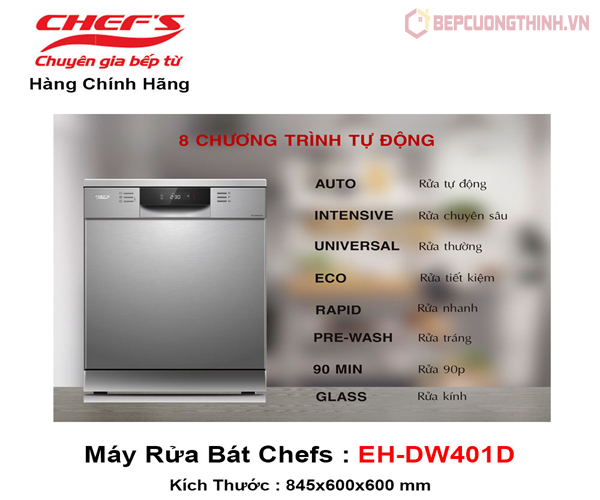 Máy rửa bát CHEF’S EH-DW401D được trang bị 8 chương trình rửa tự động, giúp bạn thoải mái lựa chọn chế độ rửa phù hợp với từng nhu cầu.